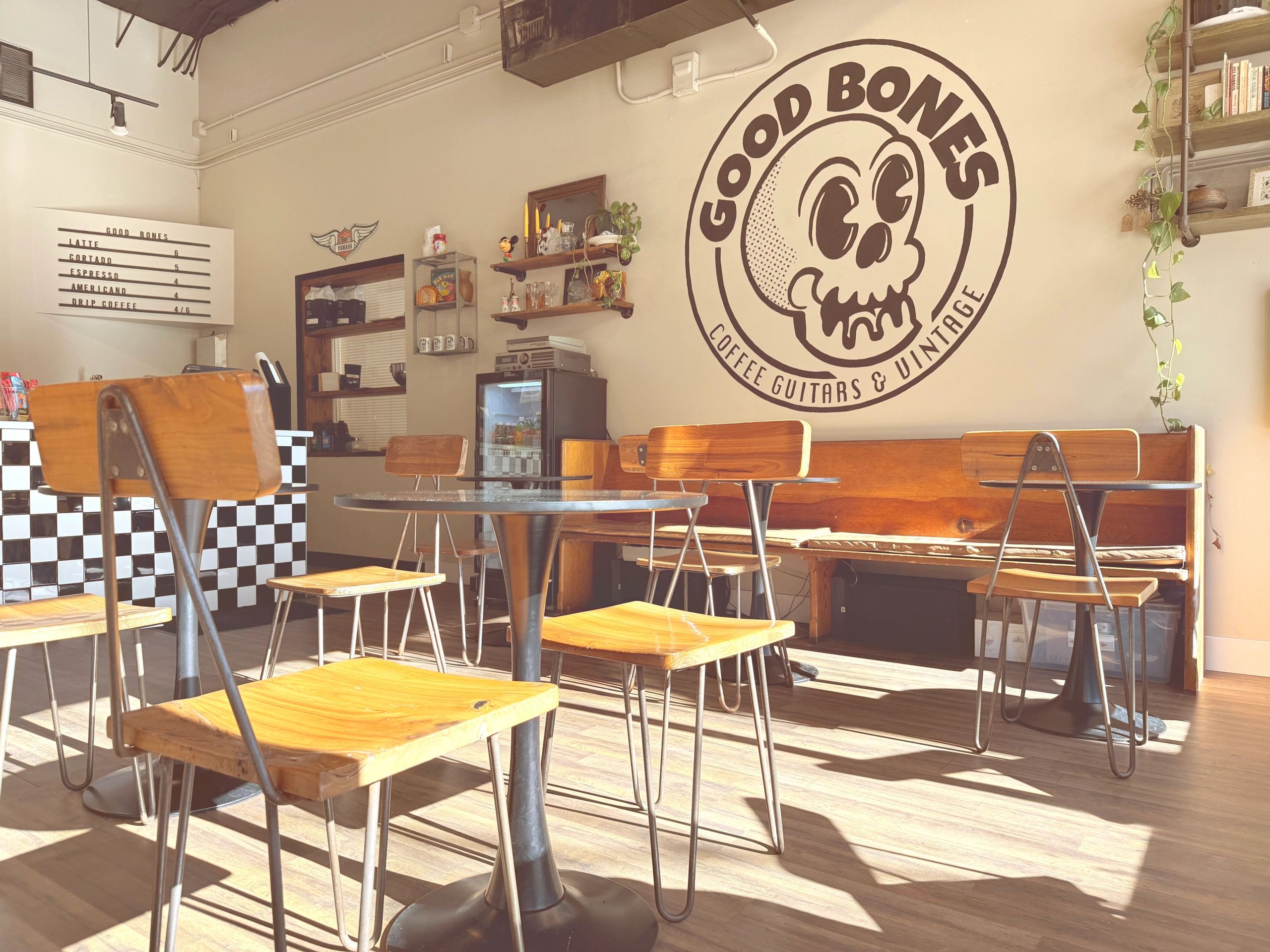 Good Bones was created by Melody and Carson Allen as a home for the things they’ve always loved most: great coffee, good music, and the timeless character of all things vintage. With deep roots in the coffee world, the Allens have spent years learning the craft and culture that make a café more than just a place to grab a drink. Their background in music infuses the space with a creative spirit, while a shared passion for vintage gear—especially well-worn guitars—gives Good Bones its unique identity as both a coffee shop and a curated vintage haven.